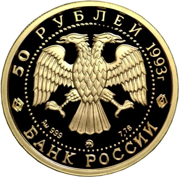 Center: Bank of Russia emblem (Bilibin's double-headed eagle). Below left: metal and fineness. Center: mint mark. Below right: fine metal content. Inscriptions along dotted rim: top - "50 ROUBLES 1993", bottom - "BANK OF RUSSIA".