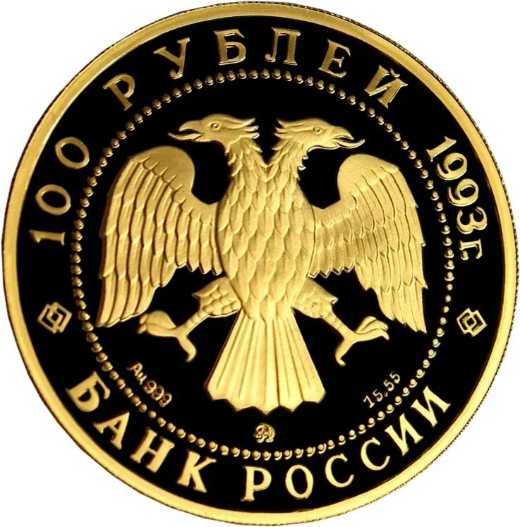 Center: Bank of Russia emblem (Bilibin's double-headed eagle). Below left: metal and fineness. Center: mint mark. Right: fine metal content. Inscriptions along dotted rim: top - "100 roubles 1993", bottom - "BANK OF RUSSIA".