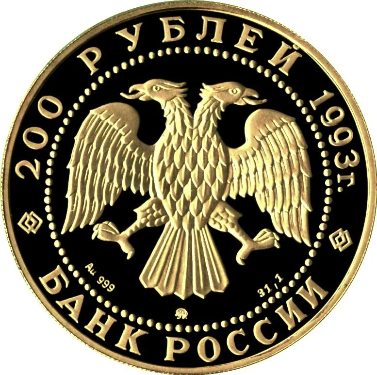 Center: Bank of Russia emblem (Bilibin's double-headed eagle). Below left: metal and fineness. Center: mint mark. Right: pure metal content. Inscriptions along dotted rim: top - "200 roubles 1993", bottom - "BANK OF RUSSIA".