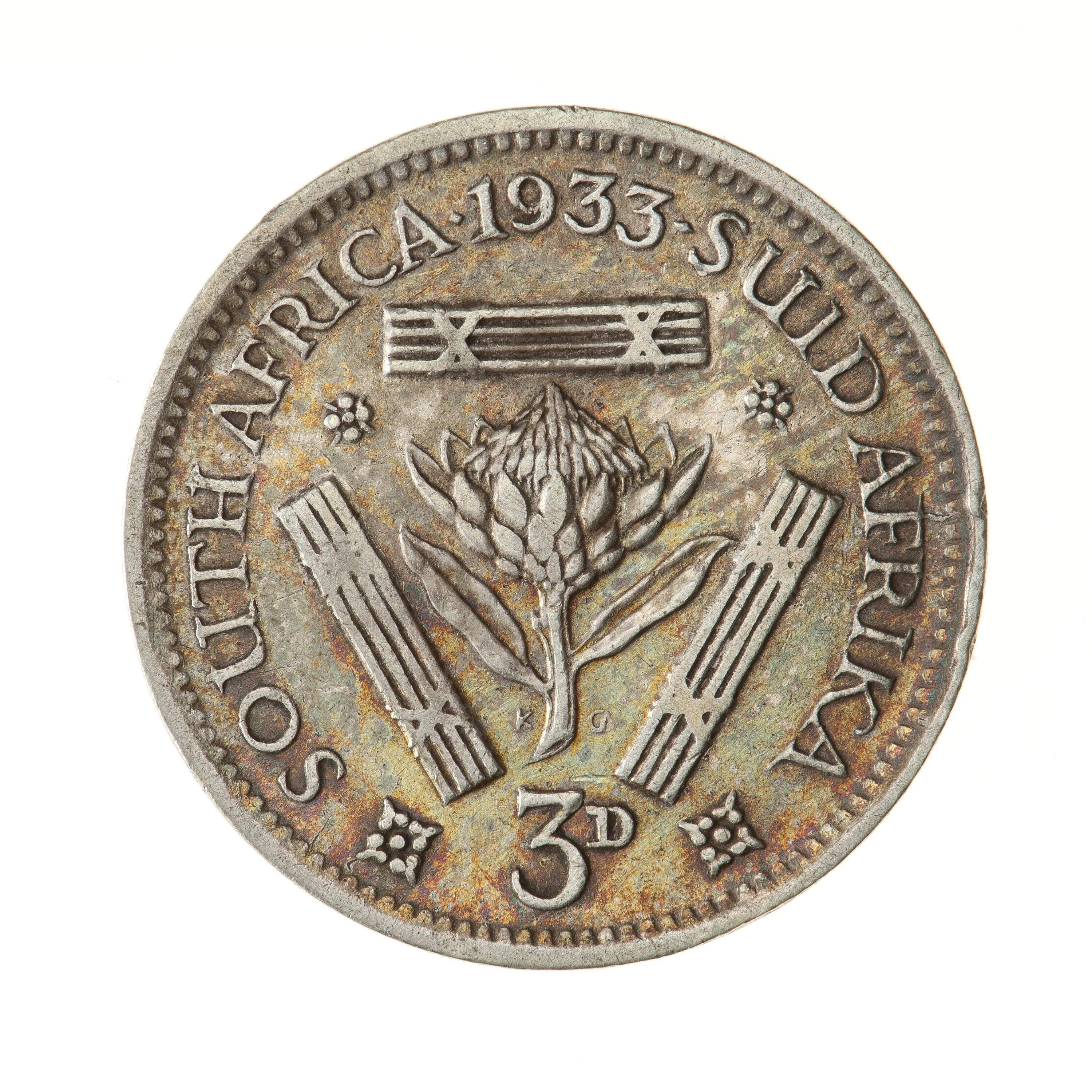 A native South African Protea flower, encircled by three bar groups. Date above, legend around, denomination below, engraver's initials flank the stem.