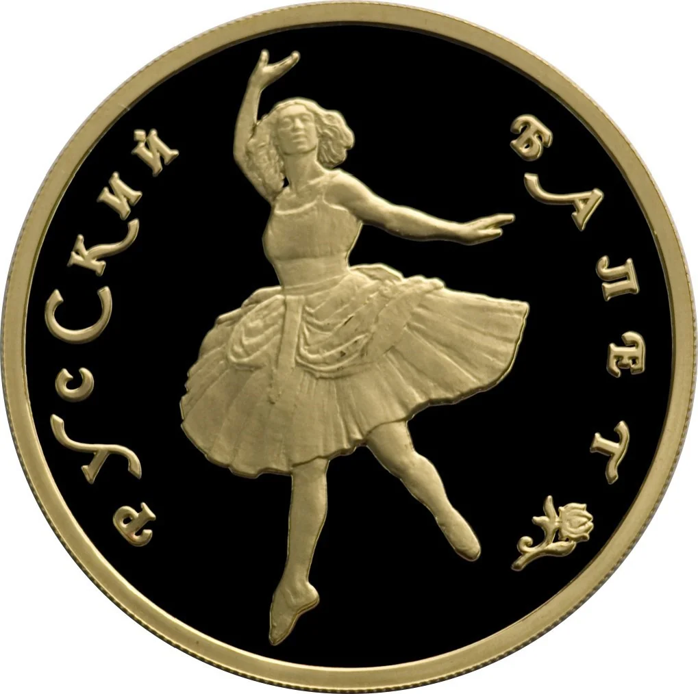 Center: a dancing ballerina. Around the rim: "РУССКИЙ БАЛЕТ" (RUSSIAN BALLET).