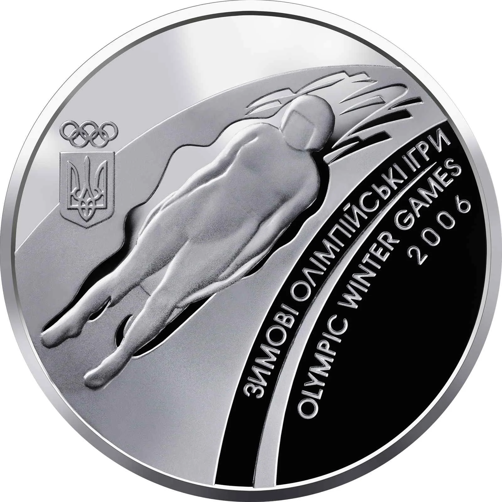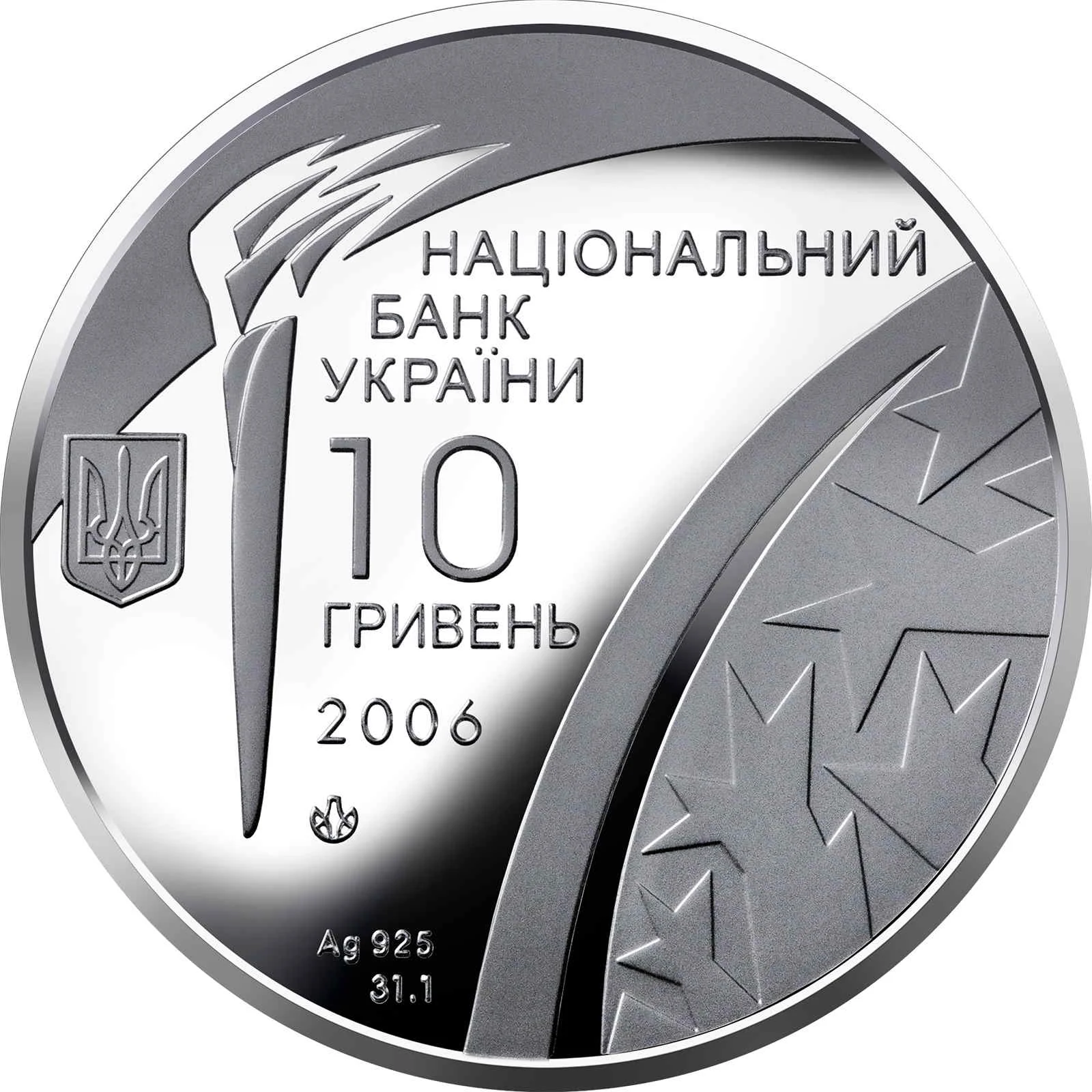 Description: The Olympic torch is shown against a stylized glass toboggan track. To the right is the text: "НАЦІОНАЛЬНИЙ БАНК УКРАЇНИ 10 ГРИВЕНЬ 2006." To the left is Ukraine's National Emblem. Below are the Mint's logotype, metal marking "Ag 925," and fine weight "31,1 g."
