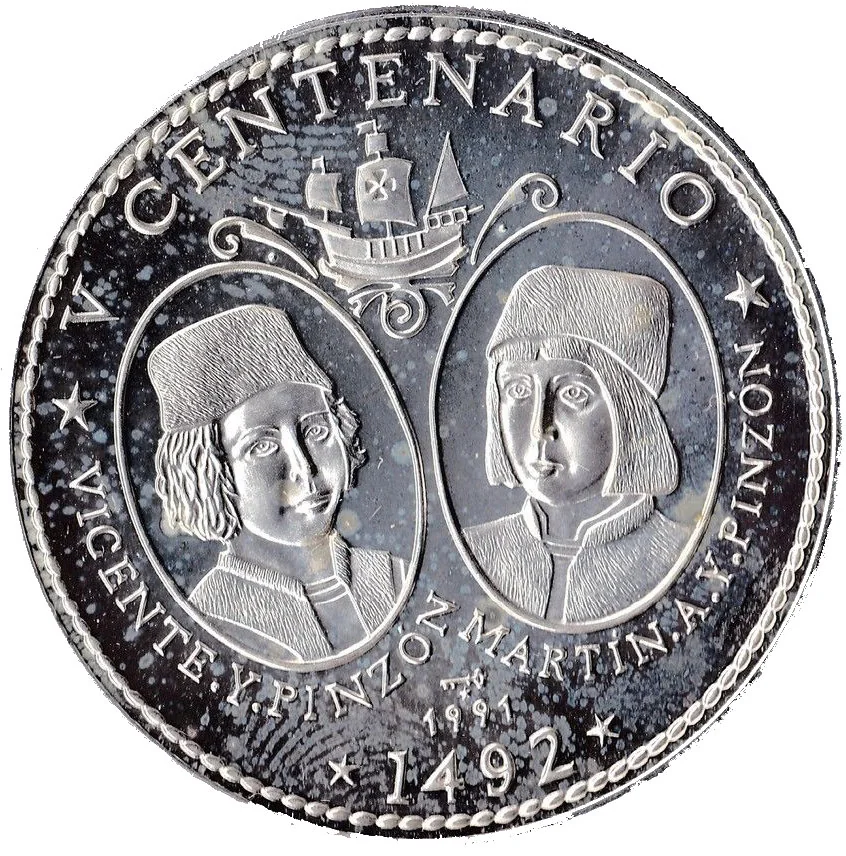 Portrait ovals of the Pinzón brothers with names below. Top: ship and event. Bottom: date. Mintmark and issue year under portraits. Rope border near edge.