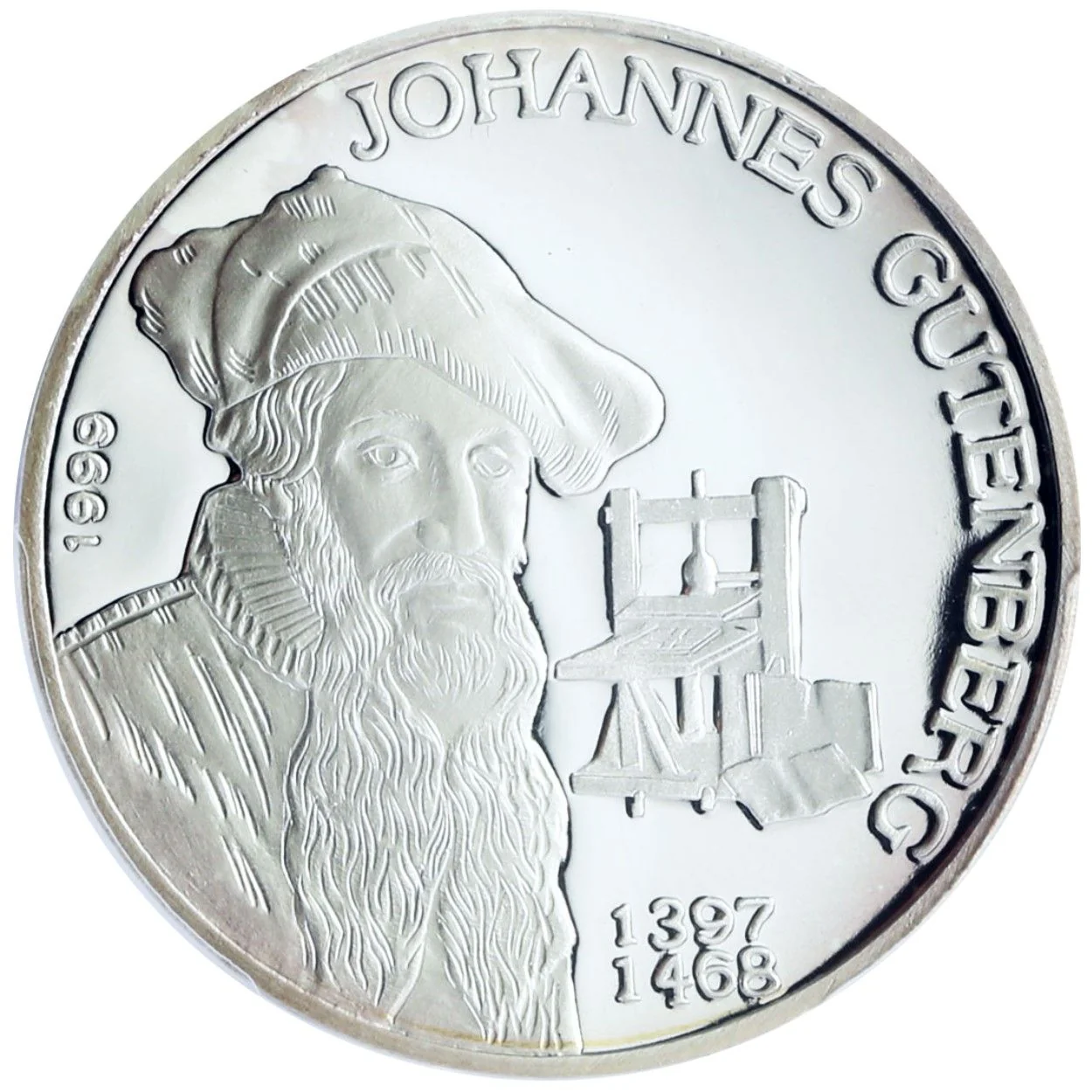 Portrait of Johannes Gutenberg, with caption and dates to the right.