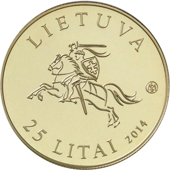 The obverse features a stylized Vytis, encircled by the inscription LIETUVA, the denomination 25 litas, the year 2014, and the Lithuanian Mint mark.