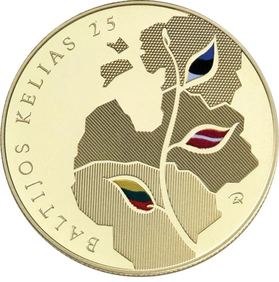 The coin's reverse features a geographical depiction of the three Baltic States, connected by an artistic road, with the inscriptions BALTIJOS KELIAS 25 (BALTIC WAY 25) and the designer's mark.