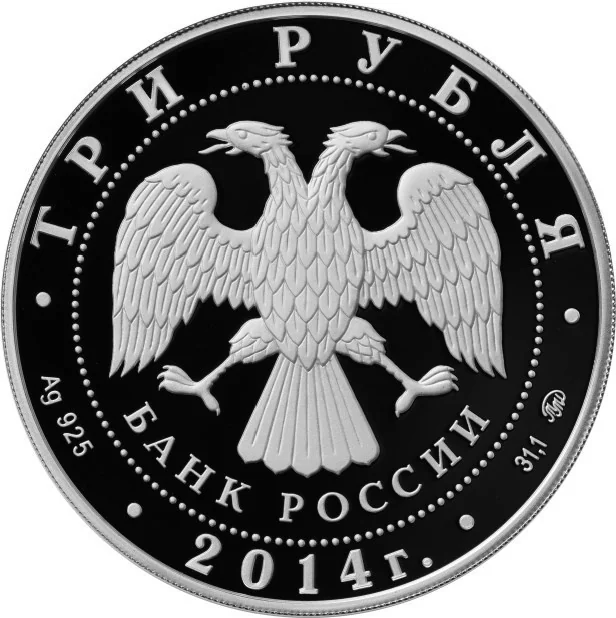 The center features the Bank of Russia emblem (a two-headed eagle with wings down, above the semicircular text "БАНК РОССИИ"), surrounded by a dotted circle. The rim inscriptions read: "ТРИ РУБЛЯ" (top); the metal, fineness, and "2014 г." (center); and the metal content and mint mark (bottom).