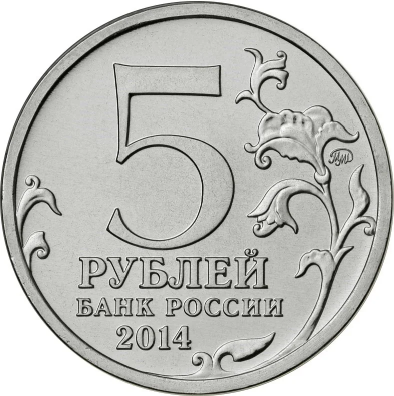 The center features the denomination "5 РУБЛЕЙ," below which are "БАНК РОССИИ" and the year "2014." Flanked by stylized plant twigs, the coin includes the mint mark near the right rim.