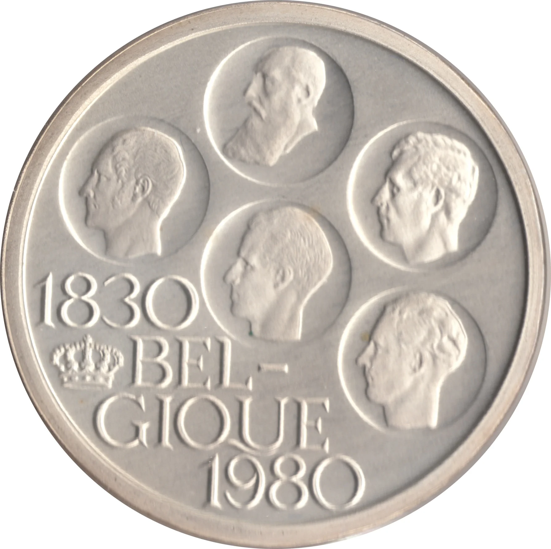 Five Belgian kings facing left in medallions. Jubilee years flank French legend, with small crown above the lower date.