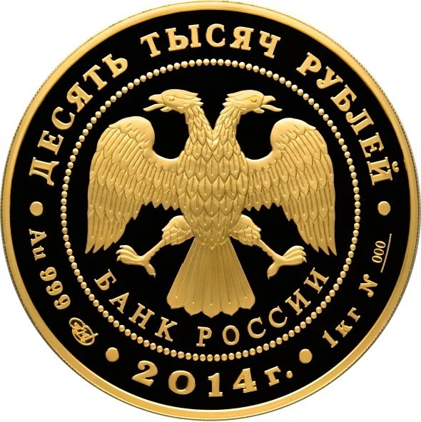 Center: The Bank of Russia emblem (two-headed eagle with wings down, "БАНК РОССИИ" below), within a dotted circle. Rim inscription: "ДЕСЯТЬ ТЫСЯЧ РУБЛЕЙ" above. Below, left: metal, fineness, and mint mark; center: year; right: metal weight and serial number.