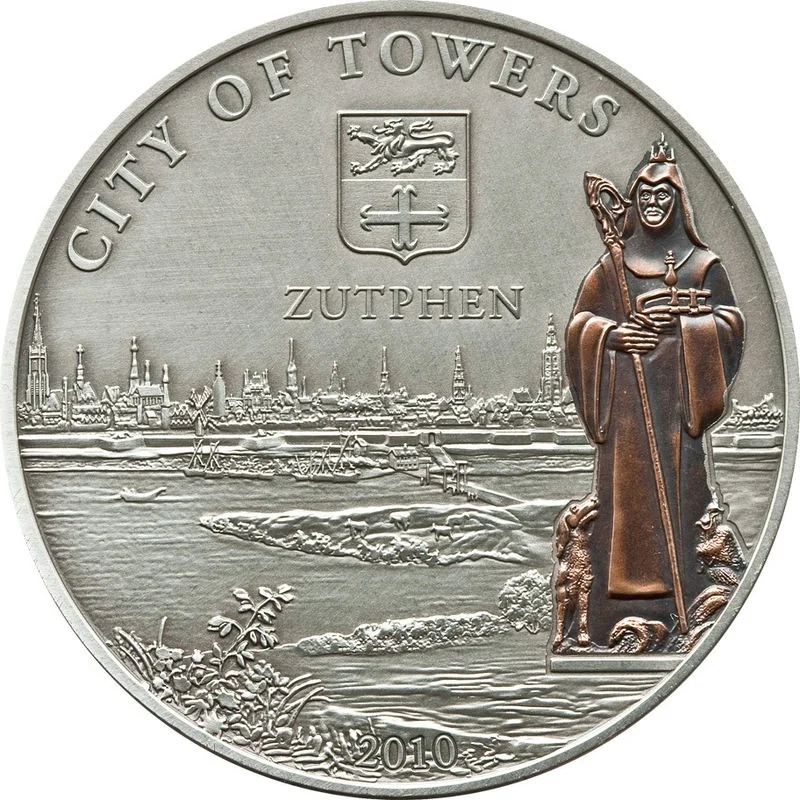 Zutphen's skyline beneath its coat of arms.
