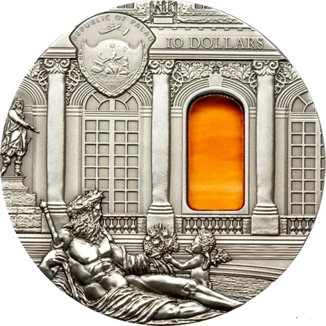 Versailles Palace: Baroque facade with an orange glass window, overlooking the Parterre d'eau fountain and front gardens.