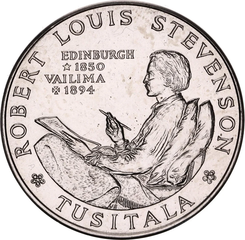Robert Louis Stevenson, seated and writing, faces left. His birth and death details appear above, encircled by a legend.