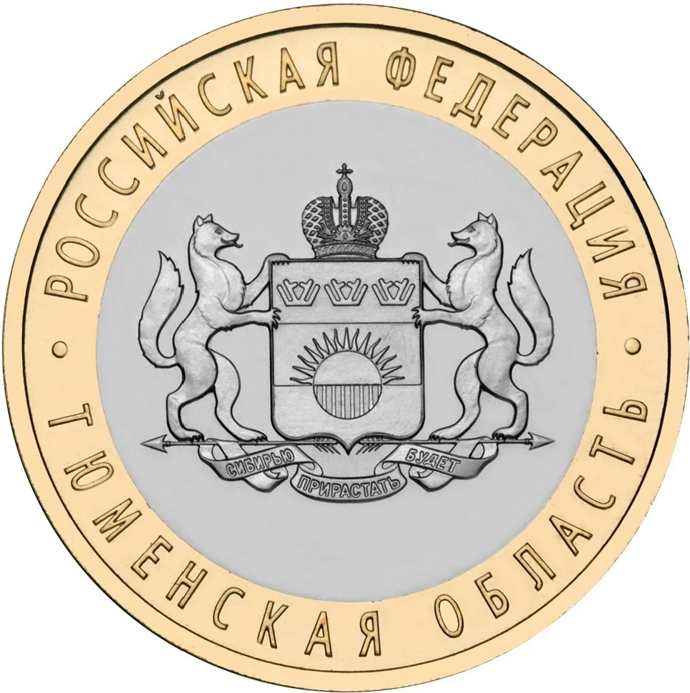 The disc features the Tyumen Region emblem, encircled by the inscriptions "РОССИЙСКАЯ ФЕДЕРАЦИЯ" above and "ТЮМЕНСКАЯ ОБЛАСТЬ" below.