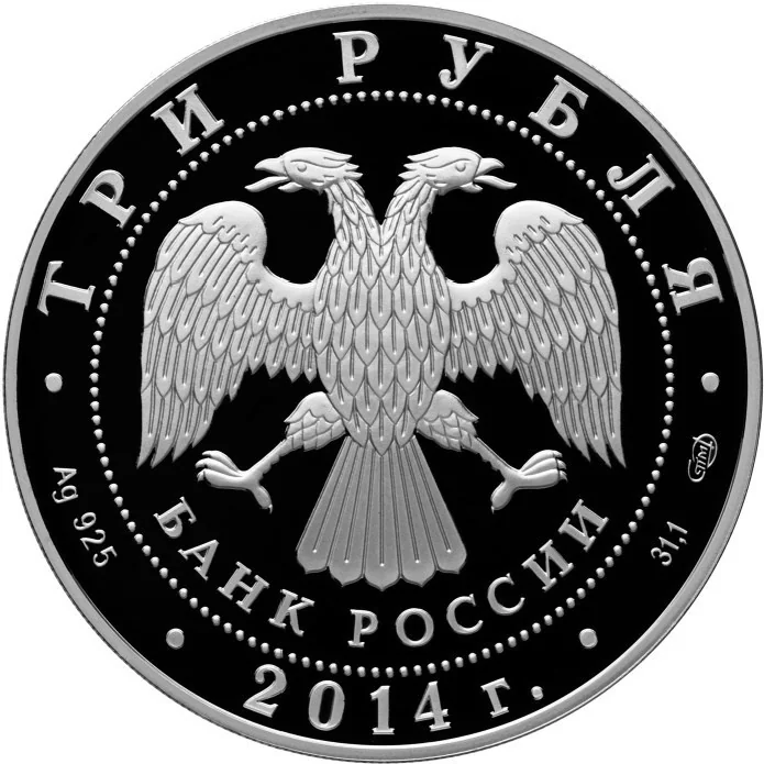 Central: Bank of Russia emblem within a dotted circle. Rim inscriptions: top – "THREE ROUBLES"; bottom left – metal and fineness, centre – "2014", right – metal content and mint mark.