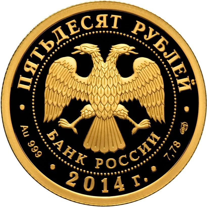 Center: The Bank of Russia emblem (two-headed eagle with wings down, over "БАНК РОССИИ") inside a dotted circle. Rim inscription: top - "ПЯТЬДЕСЯТ РУБЛЕЙ"; bottom left - metal and fineness, center - year, right - metal content and mint mark.