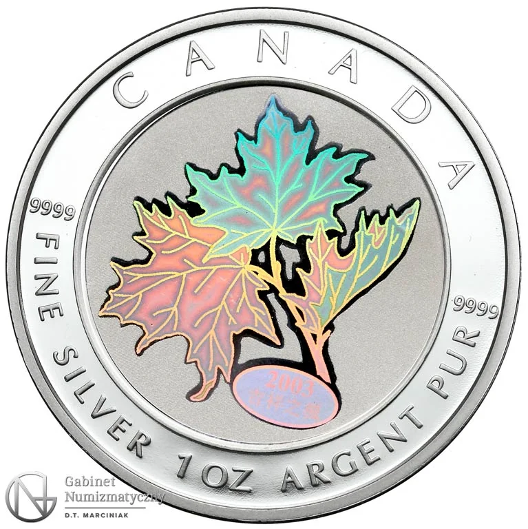 Hologram maple leaf with a 2003 privy mark and Chinese text for "good fortune maple."