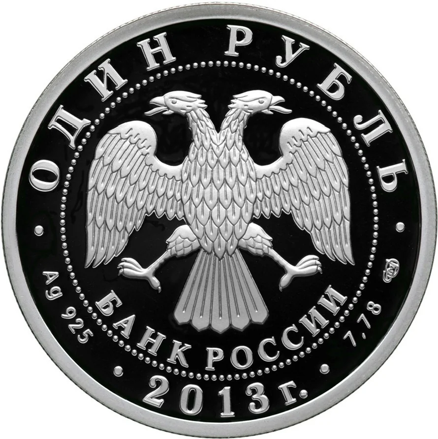 Center: Bank of Russia emblem (two-headed eagle, wings down, with "БАНК РОССИИ") within a dotted circle. Rim inscriptions: top - "ОДИН РУБЛЬ"; bottom left - metal and fineness; center - "2013 г."; bottom right - metal content and mint mark.