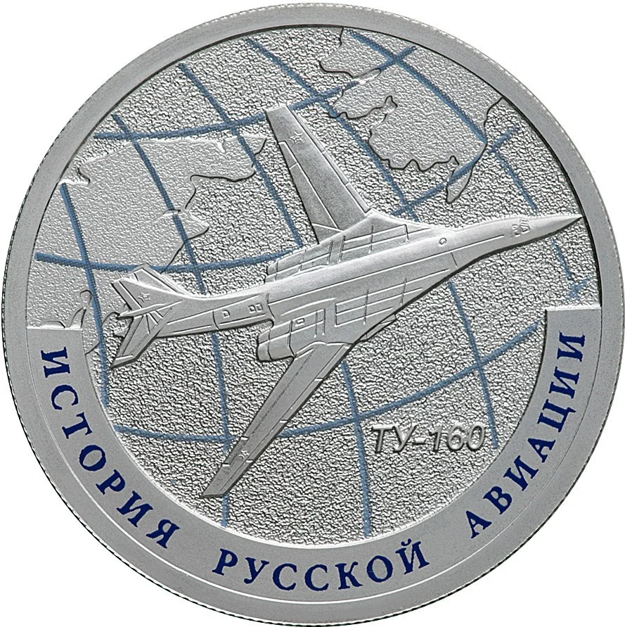 Centered on the coin, a modern arrow-wing aircraft is depicted against the globe's textured background. "ТУ-160" (TU-160) is inscribed to its right, and the rim bears the blue text: "ИСТОРИЯ РУССКОЙ АВИАЦИИ" (THE HISTORY OF RUSSIAN AVIATION).