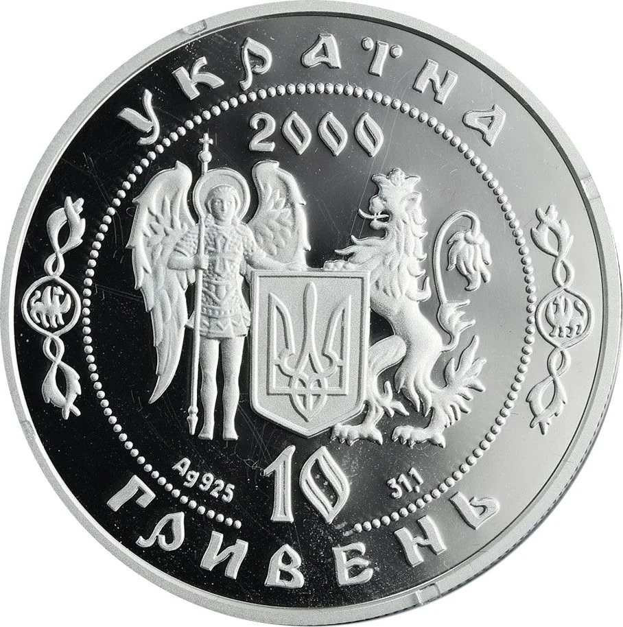 This coin is part of a series representing a unified Ukraine. It features the small National Emblem alongside the symbols of Kyiv (Archangel Michael) and Lviv (a crowned lion). The inscriptions include: УКРАЇНА, 10 ГРИВЕНЬ, 2000, Ag 925, and 31,1 g.