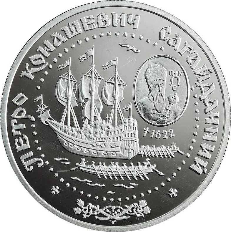 Battle scene on the Black Sea, oval Hetman portrait, death date, and circular inscription: ПЕТРО КОНАШЕВИЧ САГАЙДАЧНИЙ.