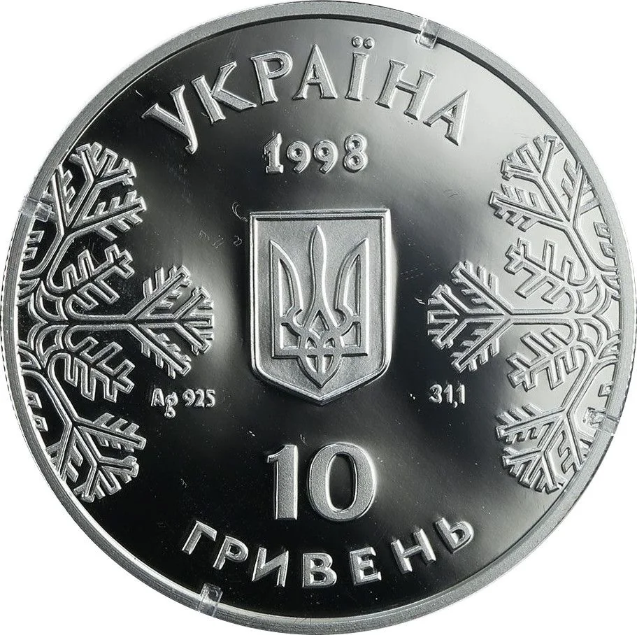 Centered is Ukraine's small National Emblem, flanked by snowflakes, "Ag 925," and the weight 31.1. Above the emblem is the year 1998. Around the circumference is the two-line legend: УКРАЇНА and 10 ГРИВЕНЬ.