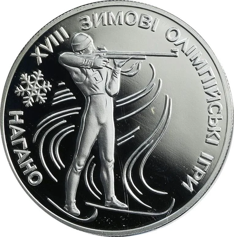 A biathlete with a gun against decorative tracks, encircled by the inscription: ХVІІІ ЗИМОВІ ОЛІМПІЙСЬКІ ІГРИ НАГАНО, separated by snowflakes.