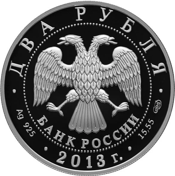Center: Bank of Russia emblem (two-headed eagle, wings down, with "БАНК РОССИИ") within a dotted circle. Above: "ДВА РУБЛЯ". Below, left to right: metal/fineness, year "2013 г.", fine metal content and mint mark.