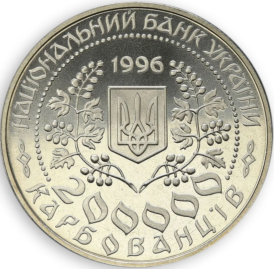 The small State Emblem of Ukraine, framed by guelder-rose sprays, is centered within a beaded circle. Above it is the year 1996. Around the circumference are the inscriptions: "НАЦІОНАЛЬНИЙ БАНК УКРАЇНИ" (top) and "2 ГРИВНІ" (bottom).