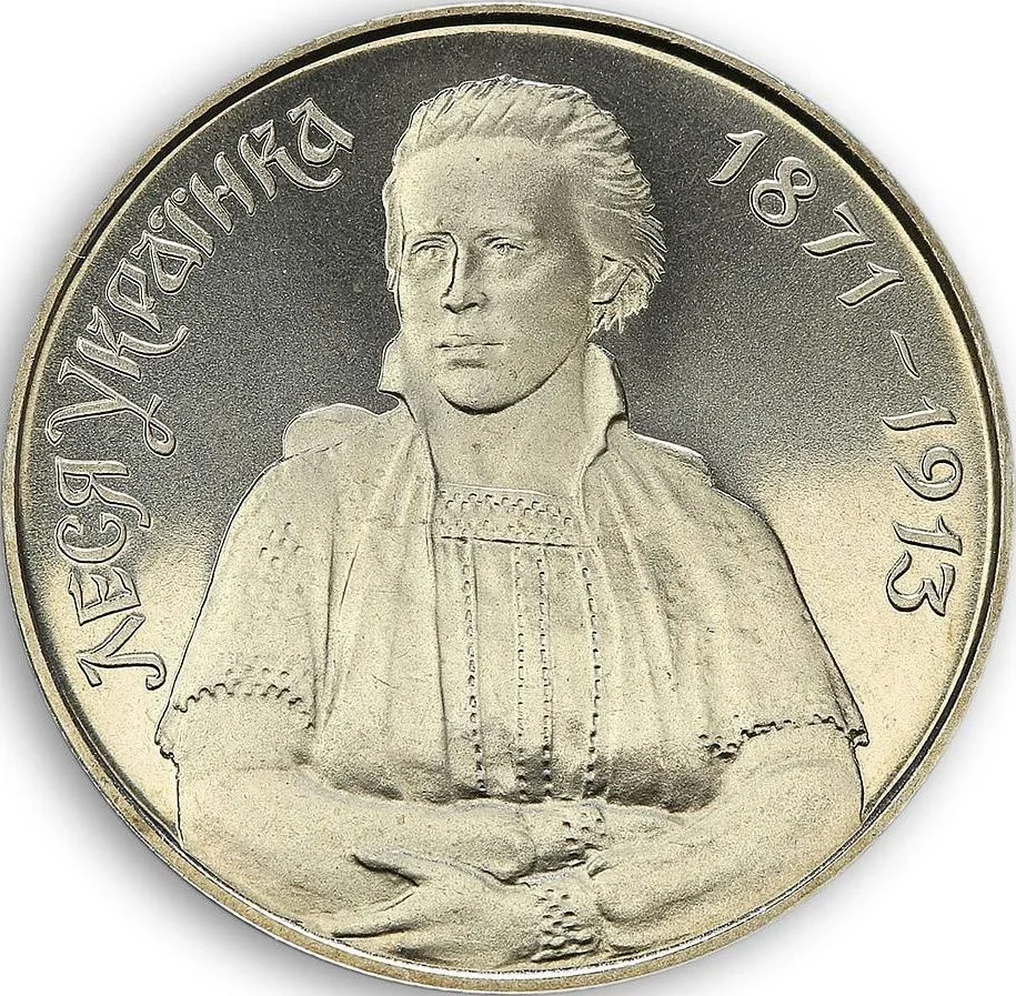 Lesya Ukrainka portrait. Left: ЛЕСЯ УКРАЇНКА. Right: her birth and death years, 1871-1913.
