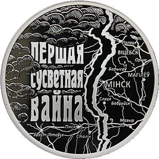 Right side: a fragment of Belarus's post-WWI political map showing the borders established by the Treaty of Riga. Left side: the inscription "ПЕРШАЯ СУСВЕТНАЯ ВАЙНА (WORLD WAR I)" overlapped by storm clouds, symbolizing the global tragedy.