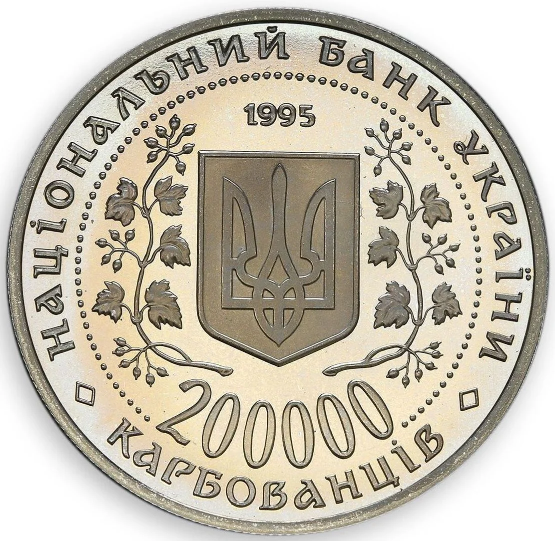Description: The Small State Emblem of Ukraine is centered within a beaded circle, framed by guelder-rose sprays, with the year "1995" above. Below the emblem is the face value "200000 КАРБОВАНЦІВ" (split by the beaded circle). Around the outer edge, the inscription "НАЦІОНАЛЬНИЙ БАНК УКРАЇНИ" is separated from "КАРБОВАНЦІВ" by rhombic marks.