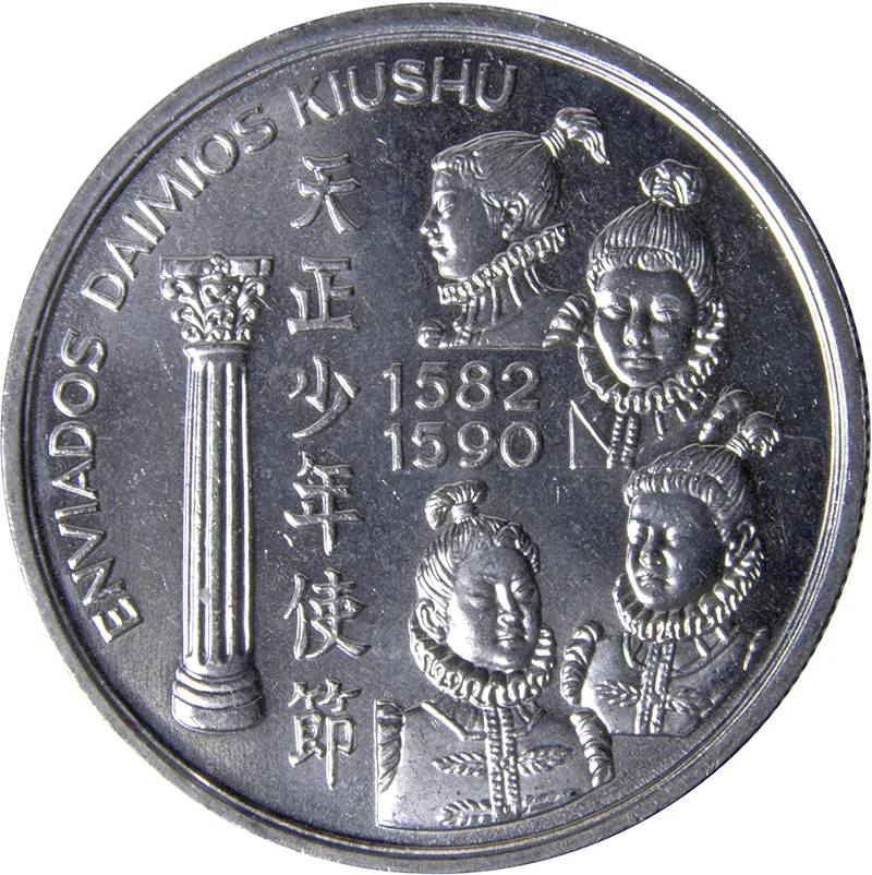 Portuguese coat of arms (left) with value and date; a 16th-century ship (right) sailing from Japan to Europe.