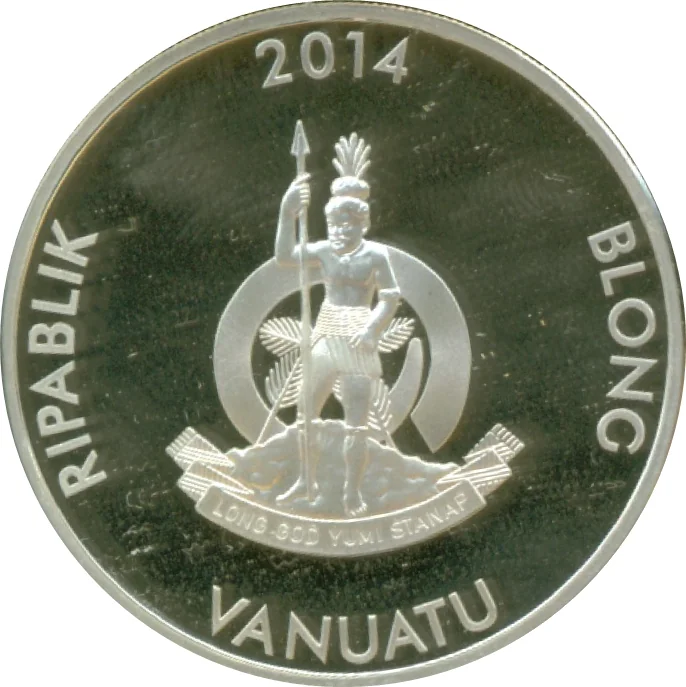 Description: Vanuatu's coat of arms depicts a Melanesian warrior before a curved boar's tusk, a scroll reading "LONG GOD YUMI STANAP," and the national date.