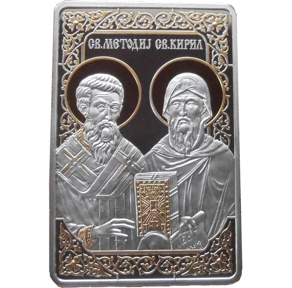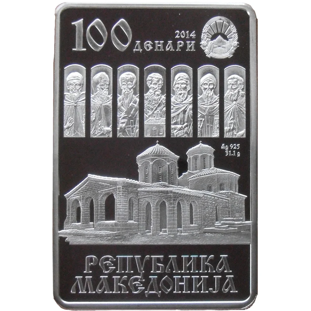 Description: The obverse features the St. Naum monastery with seven saints above: St. Cyril, St. Methodius, and their five students. Below is "Republic of Macedonia" in Macedonian. At the top right is the coat of arms, and at the top left is "1000 Denars." The year "2014" is centered at the top, and "Ag925" is on the middle left.