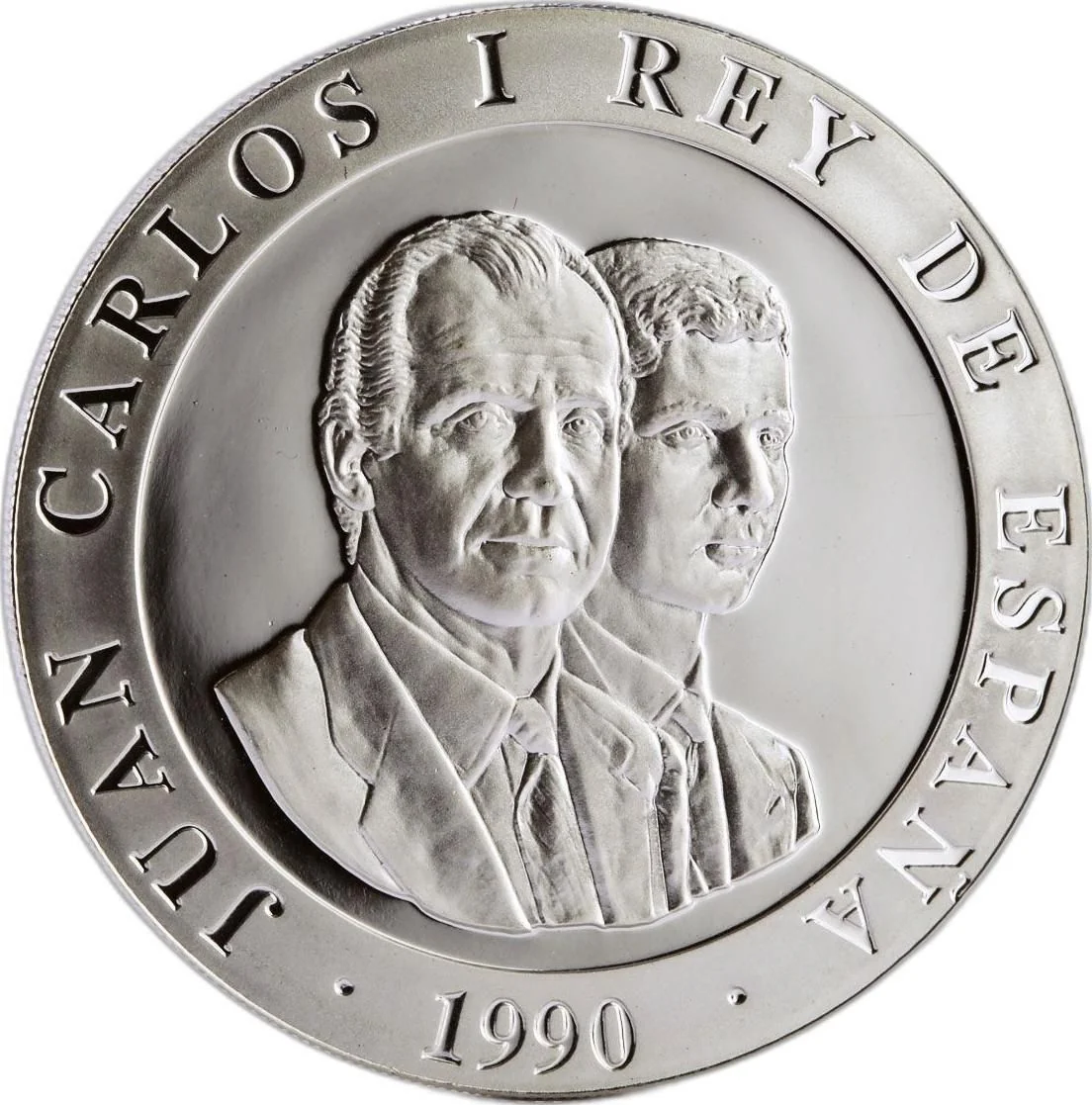 Conjoined busts of Juan Carlos I and Felipe facing right.