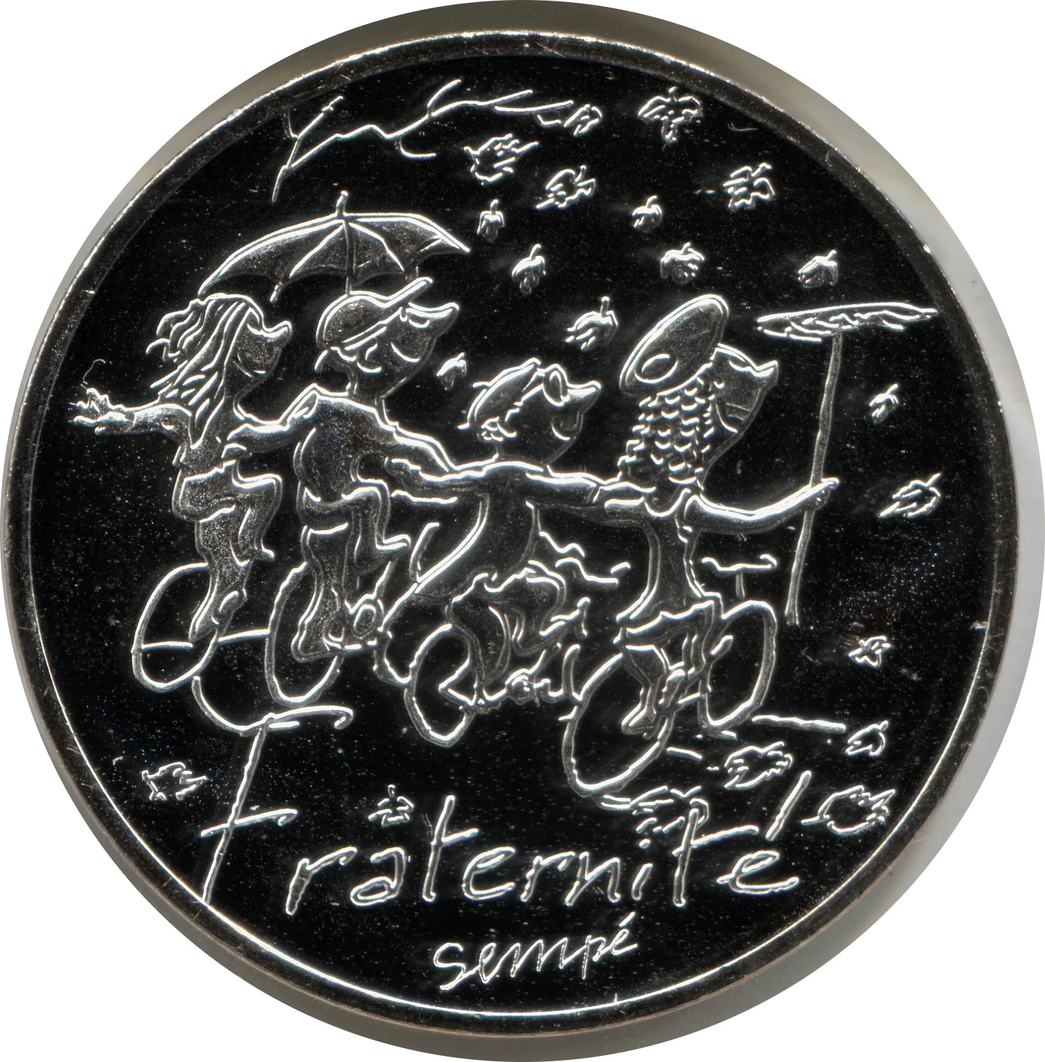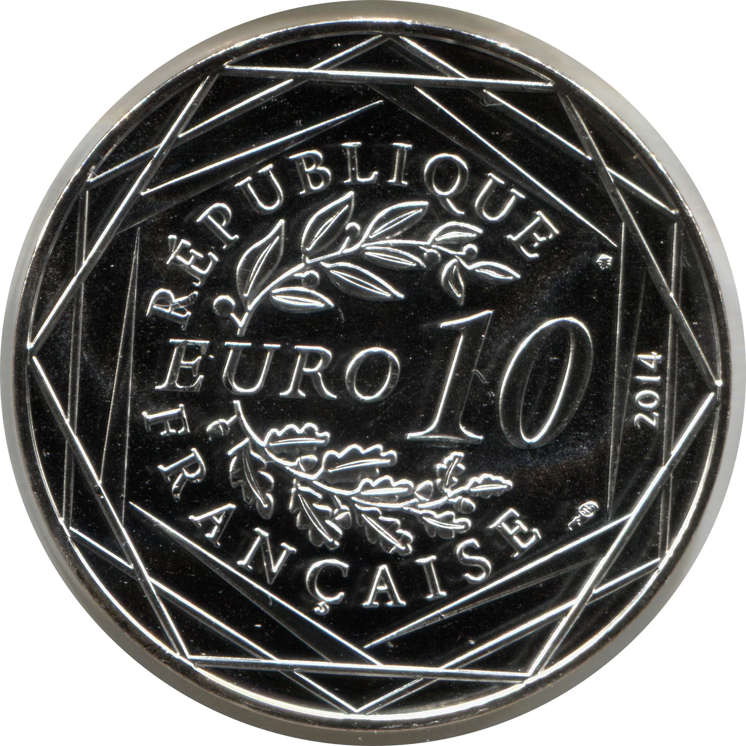 "10 EURO" flanked by laurel and oak branches, encircled by "RÉPUBLIQUE FRANÇAISE," three hexagons, and the issue year.