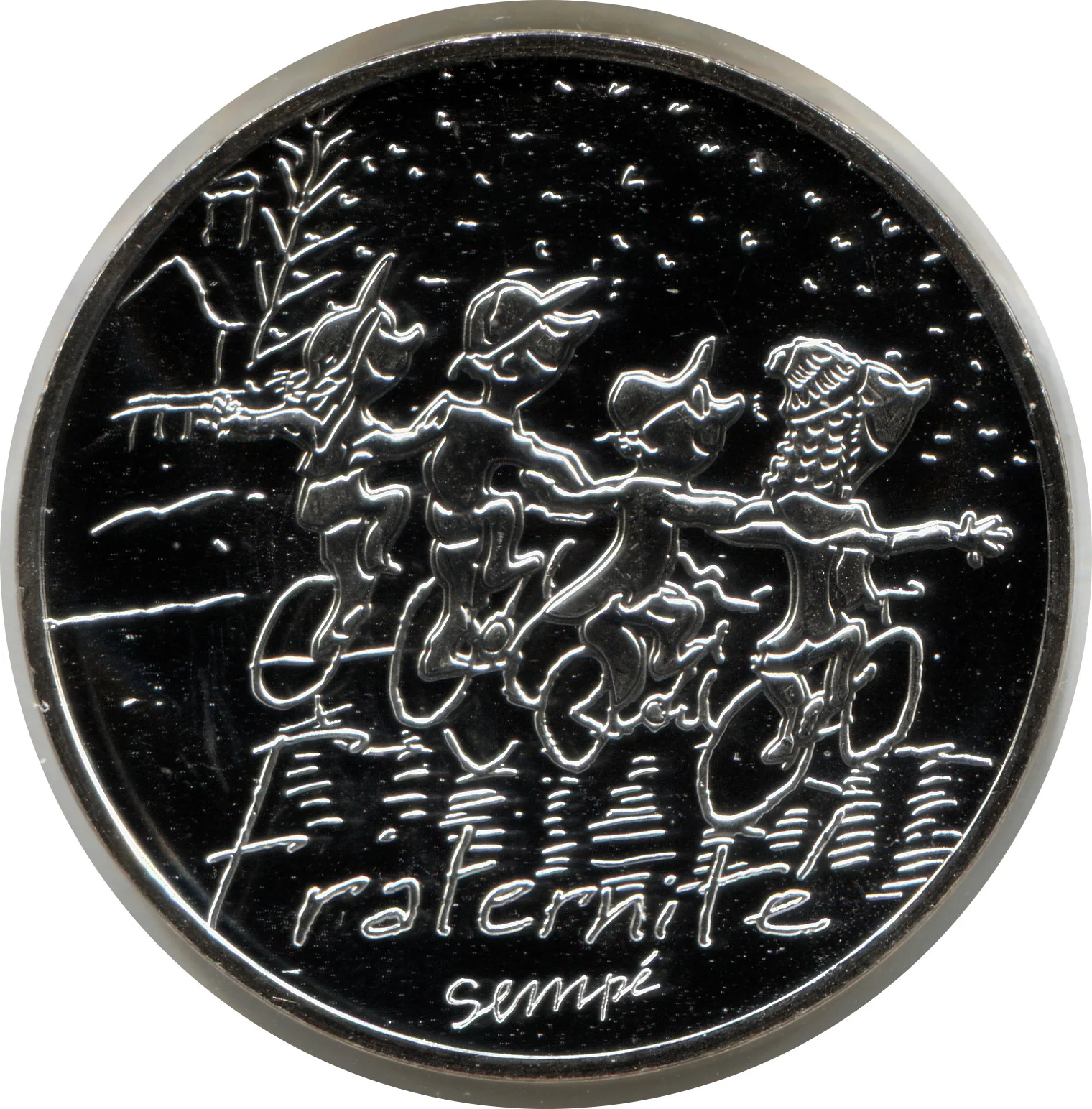 "10 EURO" flanked by laurel and oak branches, encircled by "RÉPUBLIQUE FRANÇAISE," three hexagons, and the issue year.