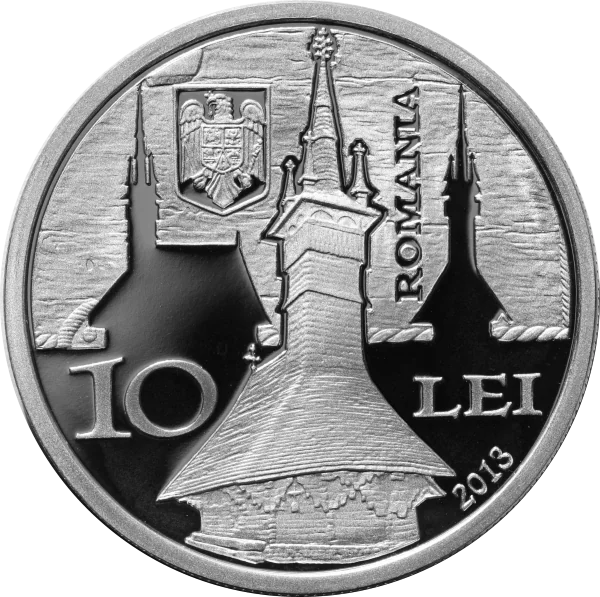 Wooden Church of the Holy Archangels in Rogoz, with front and side views overlapping an outer wall. Includes Romania's coat of arms, "10 LEI", "2013", and "ROMANIA".