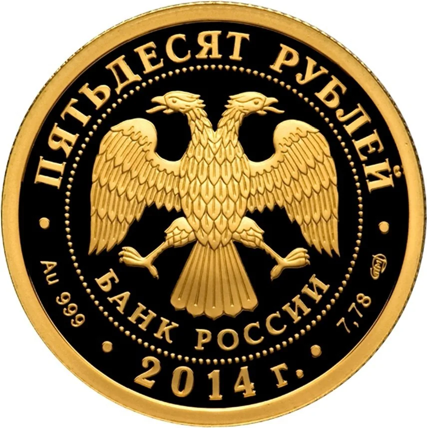 Center: The Bank of Russia emblem (two-headed eagle with wings down, over "БАНК РОССИИ") inside a dotted circle. Rim inscription: top - "ПЯТЬДЕСЯТ РУБЛЕЙ"; bottom left - metal and fineness, center - year, right - metal content and mint mark.