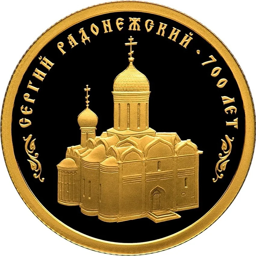 Image of the Saint Trinity Cathedral, with the rim inscription: "СЕРГИЙ РАДОНЕЖСКИЙ • 700 ЛЕТ" framed by ornamental fragments.