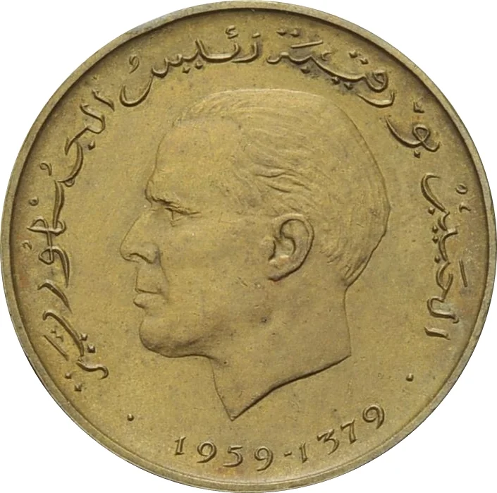 Head of Habib Bourguiba facing left. Arabic legend around rim with Gregorian and Islamic dates below.