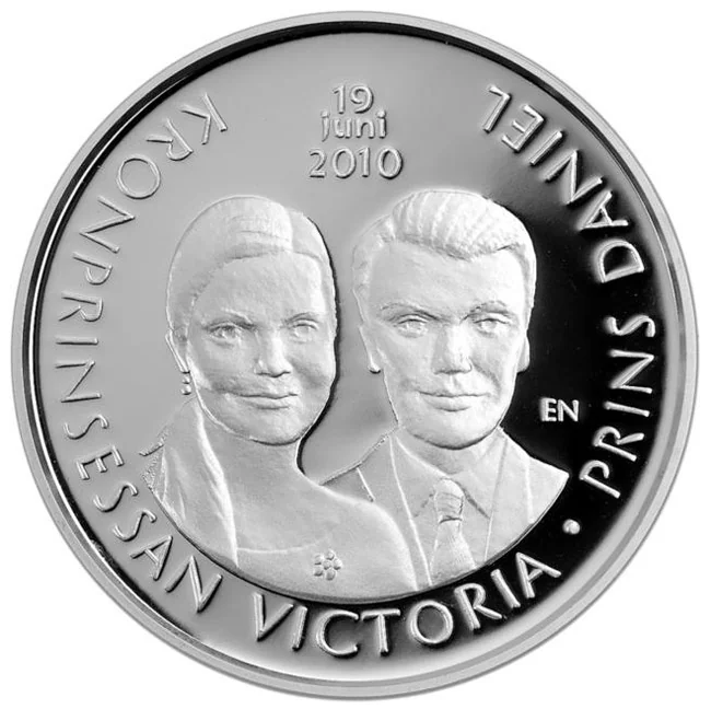 Princess Victoria’s coat of arms, with the coin's denomination, the Riksbank Governor's initials ("SI"), and the mint mark ("S"). Butterflies, symbolizing joy and happiness, also represent the couple's future home at Haga Palace.