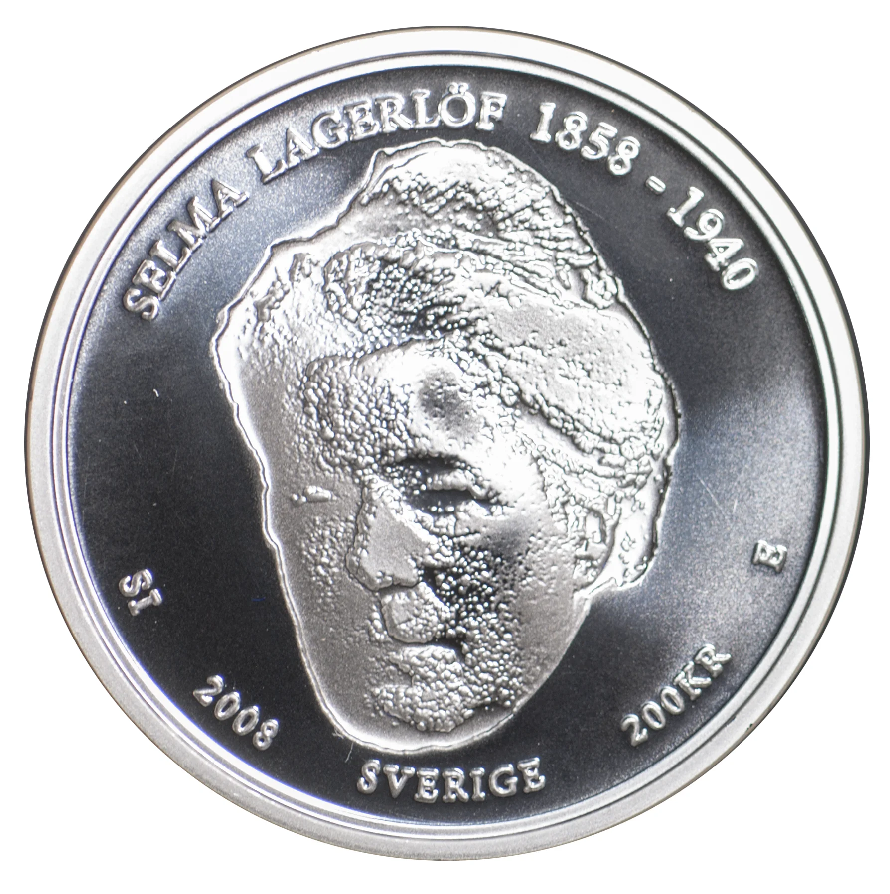 Stylized portrait of Selma Lagerlöf, based on a photo from Mårbacka. The lower edge features the Governor's initials "SI," the year, denomination, and mintmark "E." The designer's initials are below the portrait.
