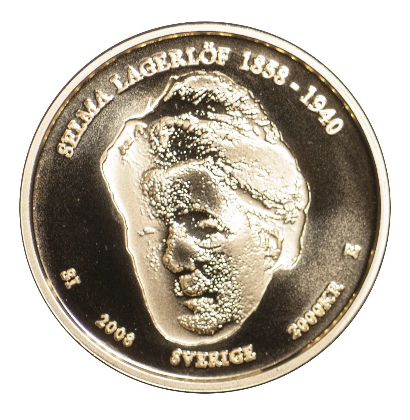 Stylized portrait of Selma Lagerlöf, based on a photo from Mårbacka. The lower edge features the Governor's initials "SI," the year, denomination, and mintmark "E." The designer's initials are below the portrait.