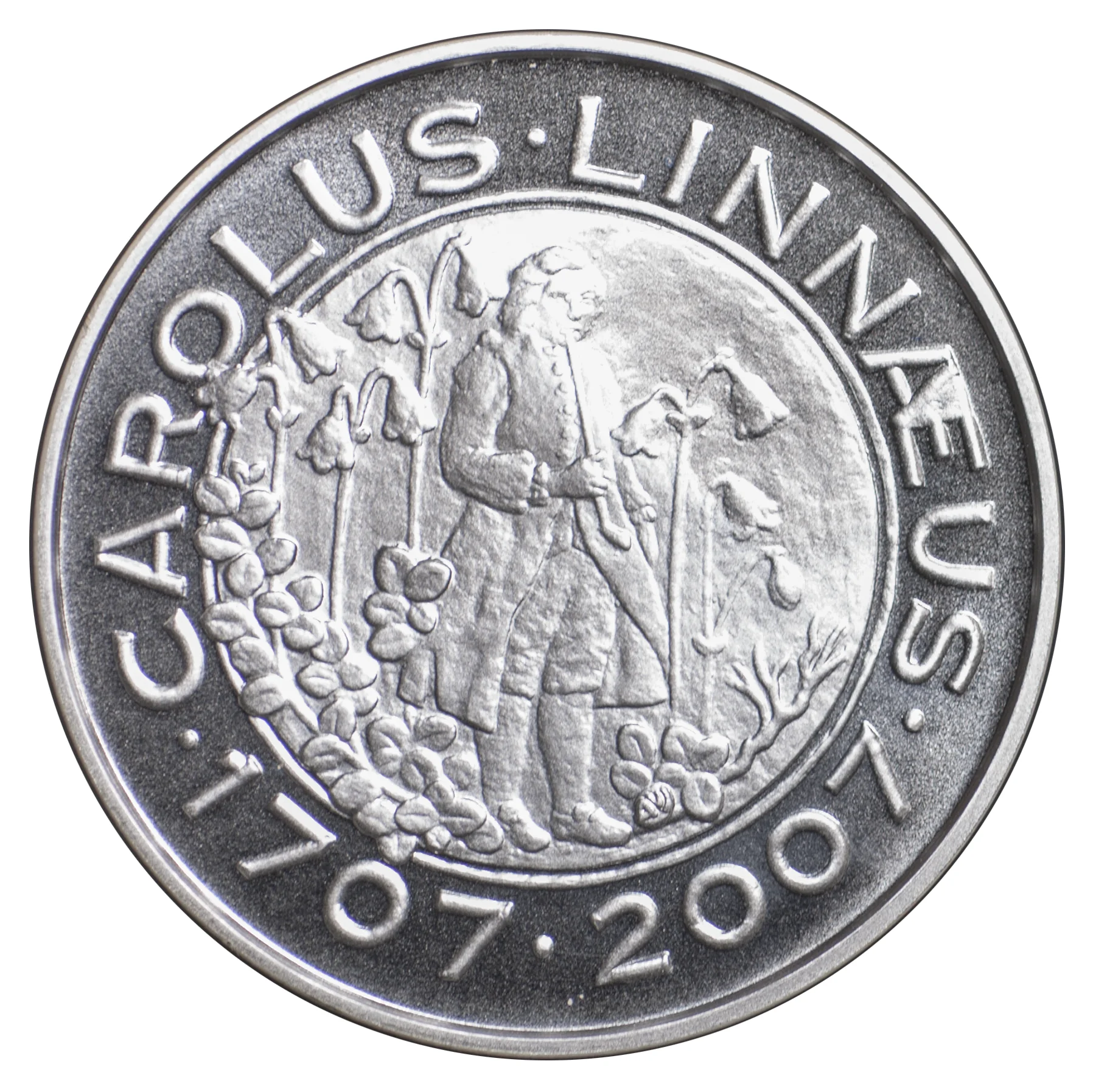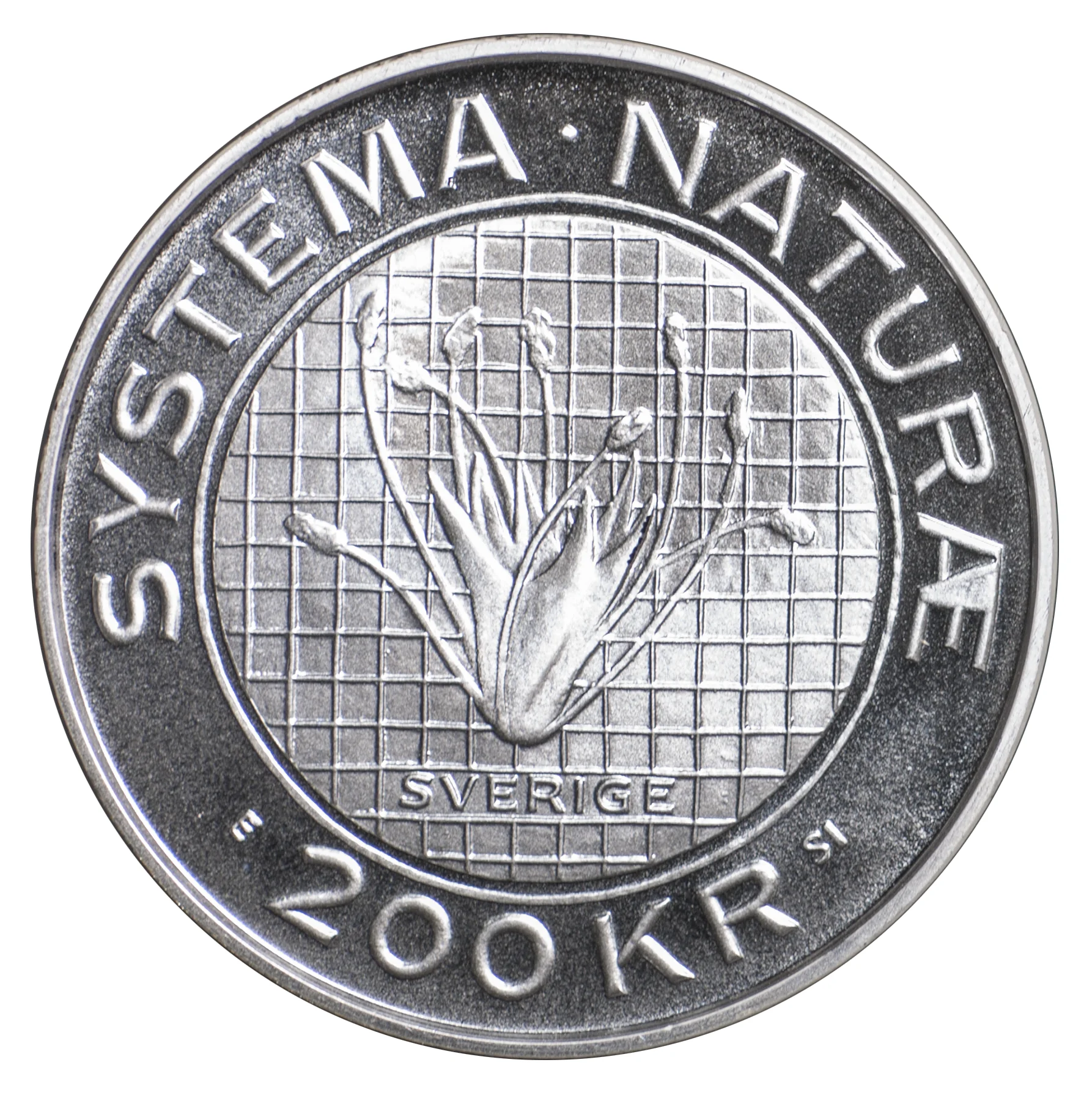 A stylized image of stamens and pistils from Linné’s 1736 “Systema Naturae” in a checked pattern, symbolizing order. The book's name appears along the top edge and its denomination along the bottom. An "E" on the left indicates the mint, and "SI" on the right are the Riksbank Governor's initials.
