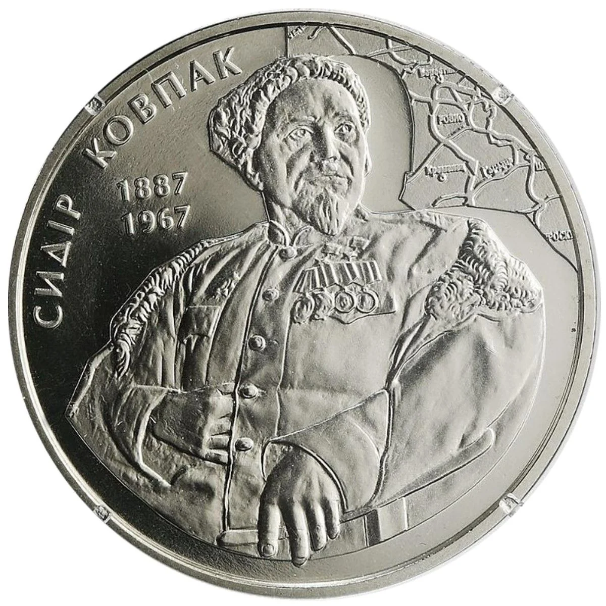 Left: Ukraine's small Coat of Arms with inscription, coin value, year, and Mint logo, flanked by laurel and two Hero Star medals. Right: On a frosted background, a book cover with inscription and Kovpak's signature.