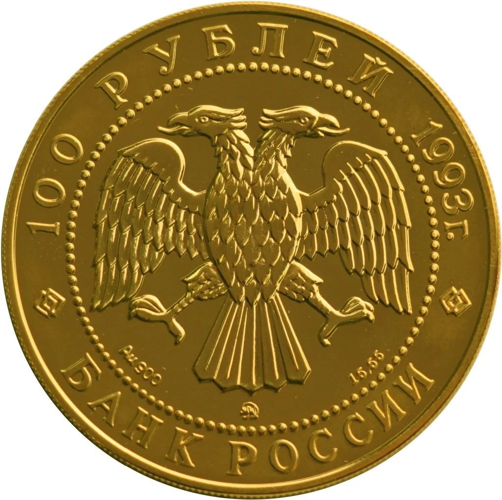 Center: Bank of Russia emblem (Bilibin's double-headed eagle). Below left: metal and fineness. Center: mint mark. Right: fine metal content. Inscriptions along dotted rim: top - "100 roubles 1993", bottom - "BANK OF RUSSIA".