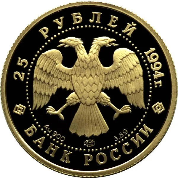 The two-headed eagle (designed by I. Bilibin) is accompanied by markings for the metal, fineness, mint, and weight. The rim inscriptions read: "25 РУБЛЕЙ 1994 г." at the top and "БАНК РОССИИ" at the bottom.