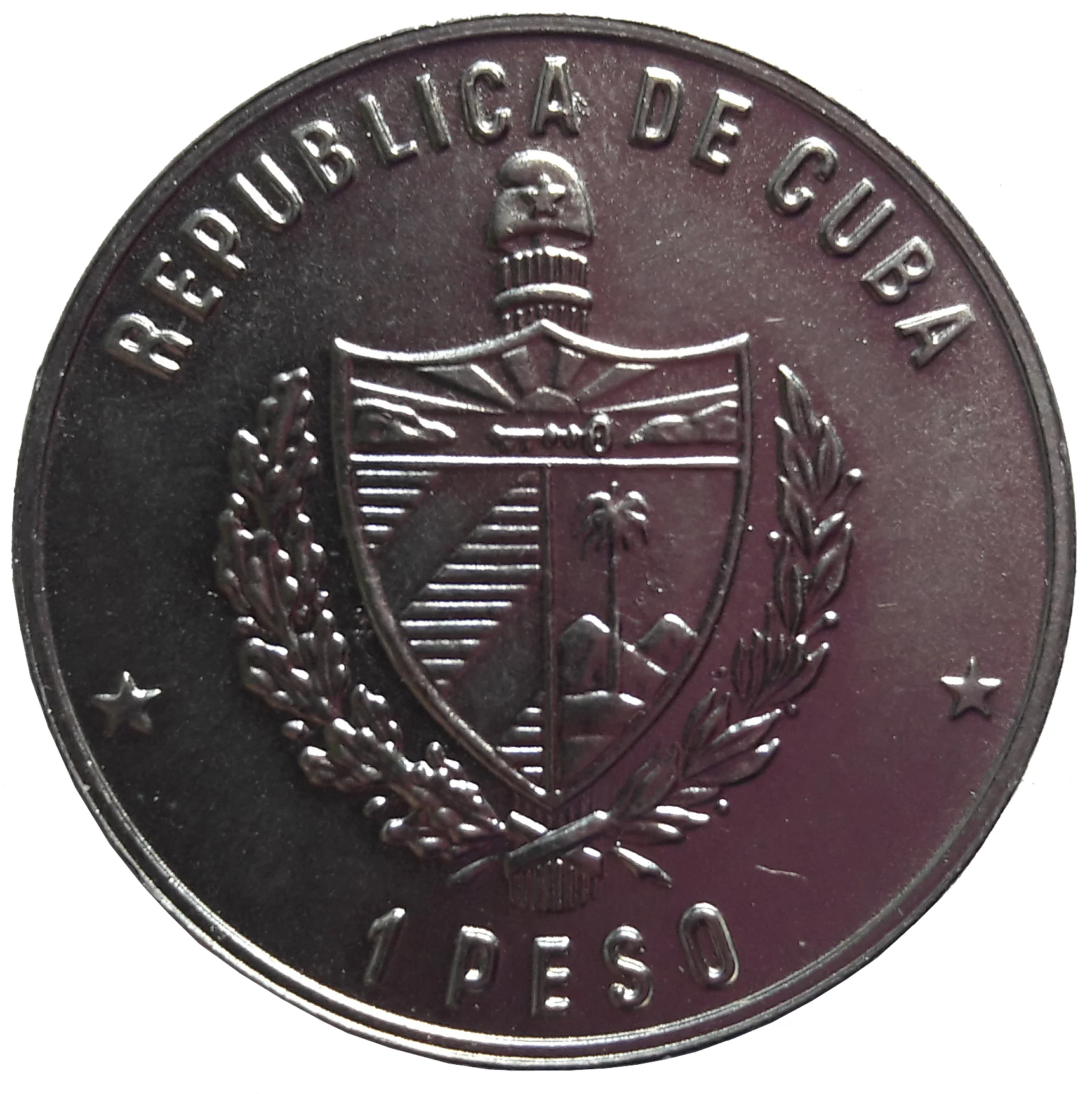 Cuban coat of arms with country name above, face value below, flanked by two five-pointed stars.